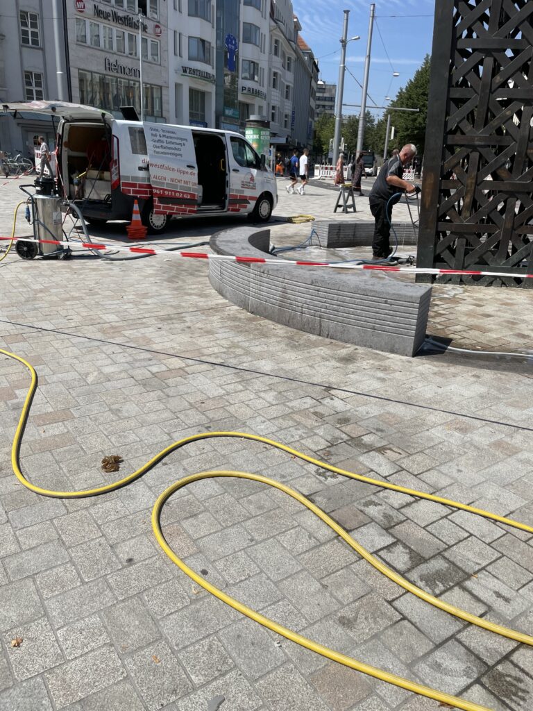 Wir reinigen Plätze und Haltestellen nicht nur sauber, sondern auch einladend und frei von unerwünschten Rückständen. Unsere spezialisierte Heißwasser-Hochdruckreinigung und Graffiti- sowie Kaugummientfernung sind zentraler Bestandteil unserer nachhaltigen Pflege von öffentlichen Plätzen und Verkehrsknotenpunkten. Wir setzen auf eine umweltfreundliche Reinigungsmethode, die nicht nur die Sauberkeit, sondern auch die Attraktivität unserer Gemeinschaftsbereiche sicherstellt.