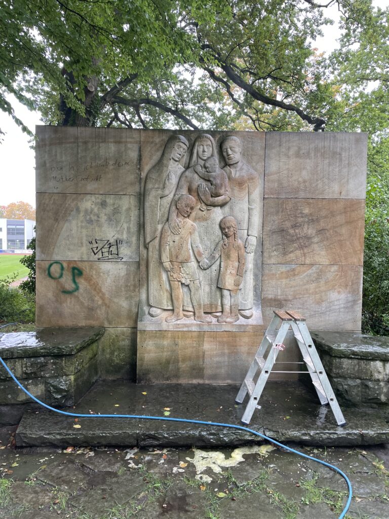 Um diese Frage richtig zu beantworten, müssen wir die individuellen Voraussetzungen betrachten. Dazu gehören das Alter des Steins, wie oft er bereits gereinigt wurde, ob er die meiste Zeit des Tages im Schatten liegt, welchen Witterungsbedingungen er ausgesetzt ist und welche Art von Stein es ist (z. B. Sandstein, Pflasterstein usw.). Diese Fragen klären wir bei einem Vor-Ort-Termin bei Ihnen. Zusätzlich legen wir eine kostenlose Probefläche an, um den Zustand nach der Reinigung festzustellen.